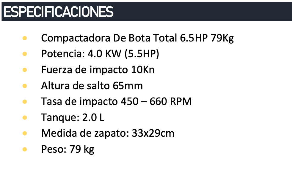 Dentro de la sección de herramientas de construcción tenemos a la Apisonadora compactadora a gasolina la cual con sus especificaciones estará a la altura de cualquier trabajo que pueda imaginar. Ideal para compactación de suelos cohesivos, para trabajos de reparación en áreas estrechas, también podría ser utilizado en arena y grava. Doble sistema de filtro de aire al motor para mayor vida útil. Sistema de soporte de choque para reducir la vibración en mano y brazo. Bufanda de poliuretano de alta calidad hecha en Alemania.