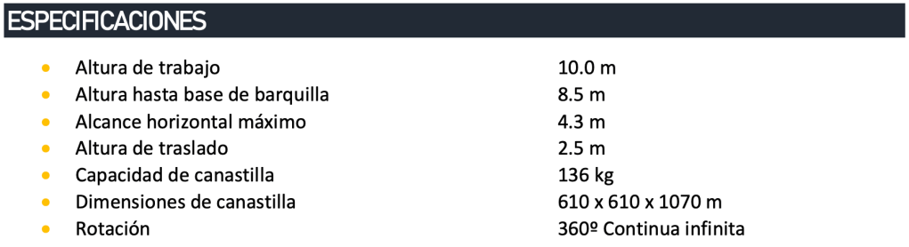Este equipo se caracteriza por brindar un desempeño superior cuando hablamos de alturas de trabajo de 10 m, poniendo a disposición algunas características sobresalientes para un elevador de este alcance, como lo es la aislación eléctrica de 46 kV.
