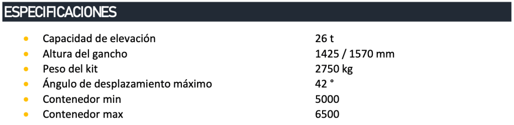 Sistema de gancho con capacidad de carga de 26 toneladas para manejo de materiales en contenedores entre 5.6 y 7.2 metros. Cuenta con dispositivos de seguridad automáticos, sistema de control remoto bob easy alámbrico para operación desde cabina, marco perforado para facilitar el montaje, rodamientos sobre el marco o bastidor y patines deslizantes intercambiables para reducir el desgaste del equipo al deslizar el contenedor, aumentando su vida útil, además de rodillo estabilizador trasero.