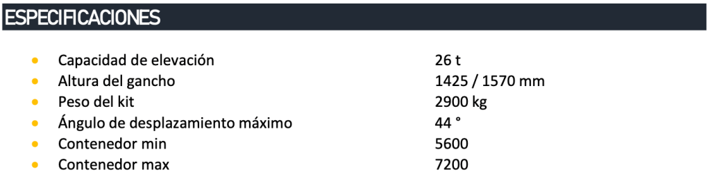 Sistema de gancho con capacidad de carga de 26 toneladas para manejo de materiales en contenedores entre 5.0 y 6.5 metros. Ideal para configuraciones de montaje junto a grúas articuladas de carga.