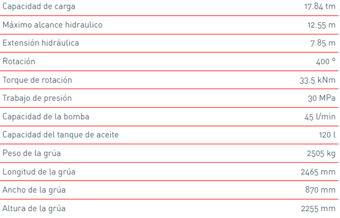 Este equipo puede se montado en camiones de dos o tres ejes y en múltiples soluciones de equipamiento. La dotación tecnológica incluye lo más innovador que existe a nivel electrónico, hidráulico y mecánico. Está equipada con dispositivos de última generación en términos de rendimiento y seguridad. Esta grúa pertenece a la clase HC1S2 (si está instalado en camión) de acuerdo a la norma EN 12999.